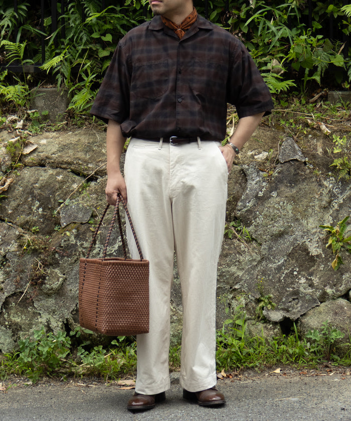 ・定番シャツ素材140/2マイクロヘリンボンファブリック。肌触り、肌離れの良い、比較的シワの気にならない表面感で、カジュアルなシーンに最適なオーベルジュオリジナルの素材。